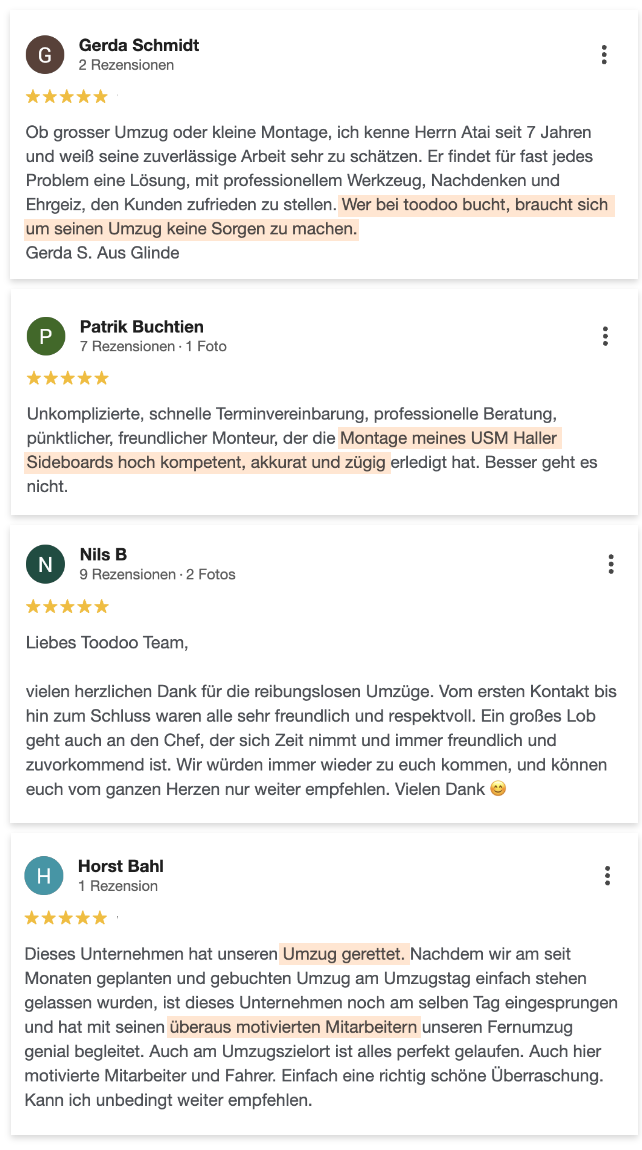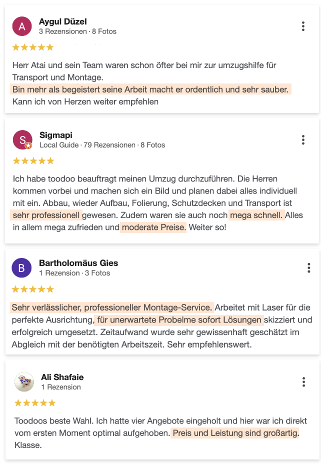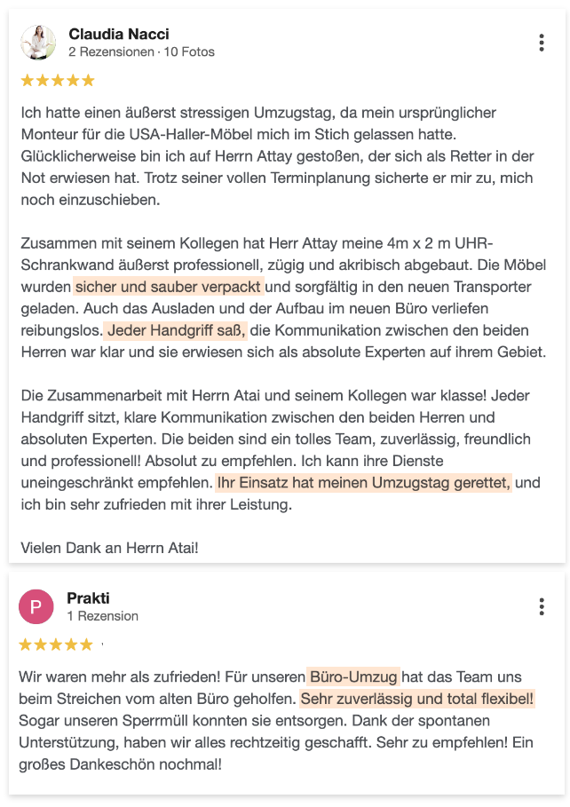 Die Dauer hängt vom Umfang und der Art der Möbel ab. Nach Ihrer Anfrage erhalten Sie eine realistische Zeit- und Kostenabschätzung, damit Sie sicher planen können.